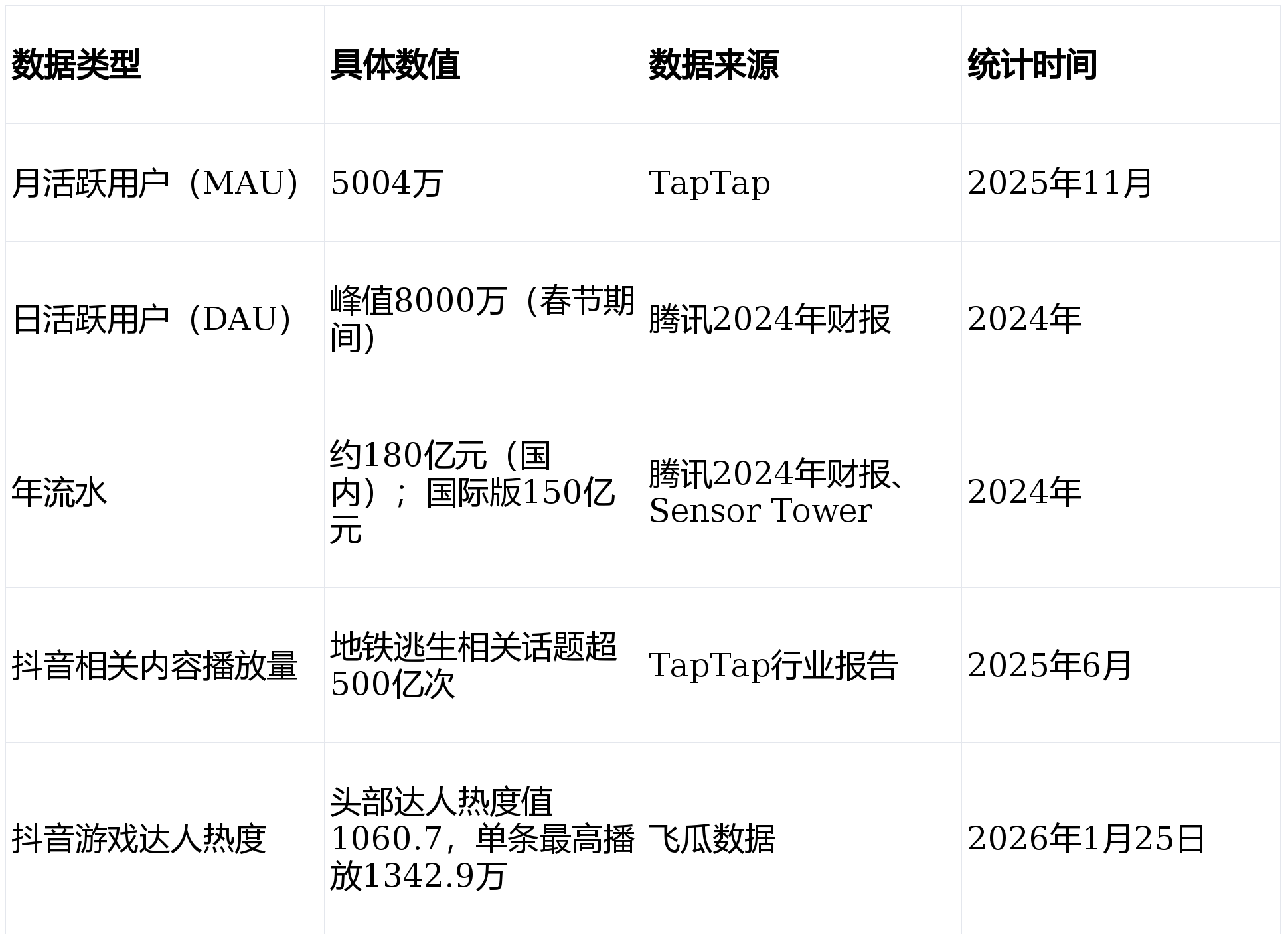 以下数据均来自腾讯官方财报、第三方权威数据机构(极光大数据、TapTap、飞瓜数据等),精准反映游戏的用户规模、营收表现与行业影响力,核心数据以表格形式呈现,方便用户快速查阅: