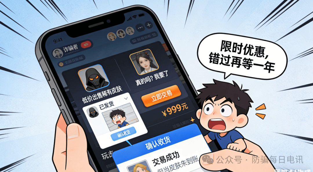 正规游戏皮肤、代练服务仅通过游戏官方平台购买,切勿相信弹窗广告、私下好友的 “免费福利”;