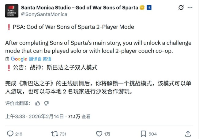 在圣莫尼卡工作室官方澄清后,玩家才得知《斯巴达之子》确实包含一个本地双人挑战模式,但需要玩家通关单人模式才可体验。这原本可能只是个小小的惊喜,让玩家在通关后获得乐趣,但由于PlayStation在宣传中提及了多人模式,反而引发了一场风波。