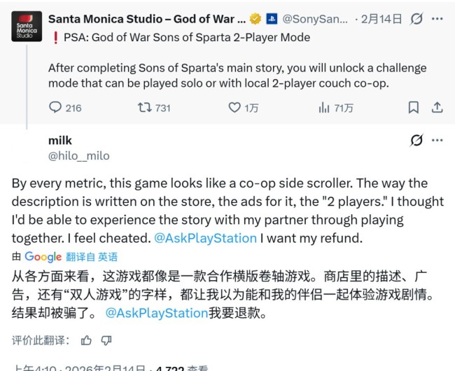 另一位名为Hilo__Milo的用户也证实了这一点,他认为这款游戏在预告片中“看起来像是一款合作横版卷轴游戏”,而且广告宣传中也明确表示有双人模式。因此,他要求退款,因为他想和伴侣一起玩。